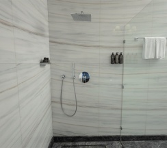 В ванной комнате расположена зона с термостатическим тропическим душем, для удобства гостей предлагаются халаты, тапочки и косметические принадлежности.