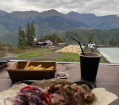 Красивые виды, но домики очень маленькие. Вкусное меню в Горилле. Места на 2 человека норм, на 3х уже мало. Ребенку там делать почти нечего, только хаски и олени. Спасибо что до домиков довозили от парковки. Наверху жарко, внизу прохладно. После 17 там только в Горилле сидеть до 19.