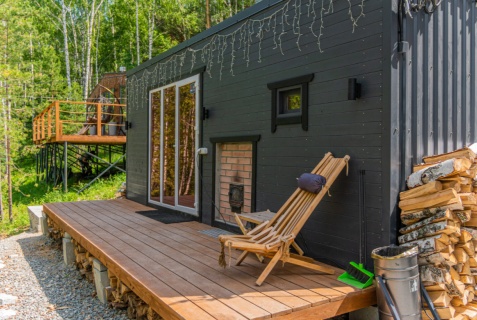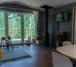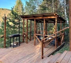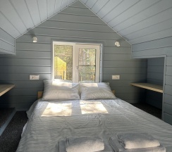 Дома вместительностью от 2х до 8 ми человек расположены в лесу на склоне горы. Панорамные окна, шикарный вид. В каждом доке есть камин, терраса, тёплый пол, комфортный санузел, горячая вода, удобные кровати с белоснежным бельём. Тапочки, зубные и бритвенные наборы, полотенца, шампуни, бальзамы и другие вещи для вашего беззаботного отдыха. Уровень комфортабельного отеля в лесу. Кухня с посудой и всем необходимым для приготовления еды, посуда для торжеств.