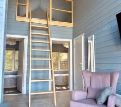 Дом в стиле барнхаус с вторым светом, камином, терассой. Две спальни на первом этаже, антресольная спальня на втором и большой диван-кровать в гостиной. Просторный санузел. Мангальная зона.