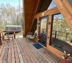 Треугольный дом в стиле А-фрейм с панорамным остеклением и шикарным видом. Спальня на антресоли, второй свет, камин, кухня, санузел диван, большая терраса. Тихое место в окружении леса и гор.