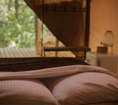 все удобства есть в самом домике-палатке, при полной атмосфере леса. сотрудники глэмпинга вежливы, ненавязчивы. в целом, очень комфортно.
