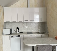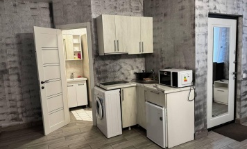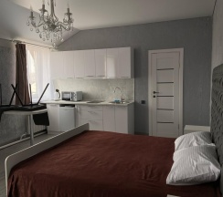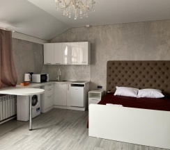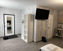 Уютный номер-студия. В номере есть ванная комната, а также вся необходимая бытовая техника для проживания: smart TV, стиральная машина, кухонные принадлежности (плита, микроволновая печь, чайник). Большая двуспальная кровать, шкаф для хранения вещей.