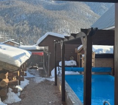 Приятный отель, чистый, удобный номер, есть все необходимое, банька, теплый бассейн порадовал, мангал, беседка на территории, удобное расположение, остановка автобуса рядом, на горнолыжку можно спокойно добраться на нескольких маршрутах, через дорогу магнит, в шаговой доступности кафе, столовые, рестораны. На ресепшен приветливые сотрудники. Немного прохладно было в номере, но есть дополнительно электронагреватель, пользовались. Рекомендуем!