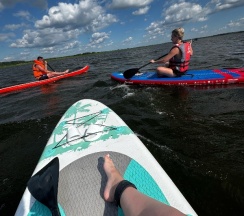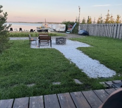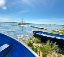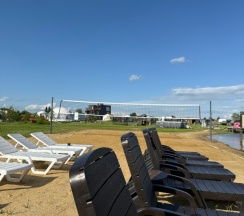 Есть возможность арендовать баню, заказать прогулку на катере, взять в аренду сап или велокатамаран. Есть шезлонги на пляжике, место для игры в пляжный волейбол, детская площадка и батут для ребятишек.