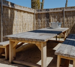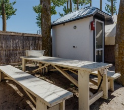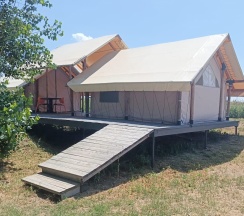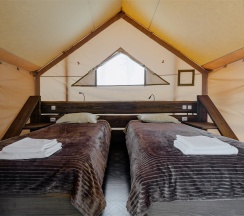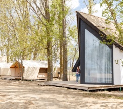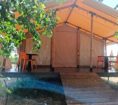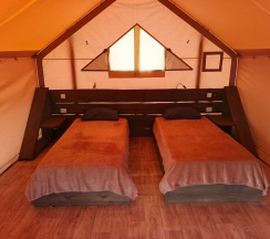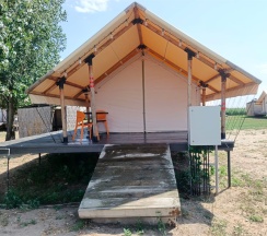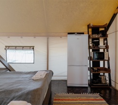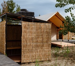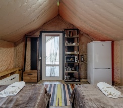 Вместимость до 3 мест. Один ребёнок до 12 лет — можно без отдельного спального места. У каждого глэмпинга имеется летний душ. На территории предусмотрен общий санузел с душем.