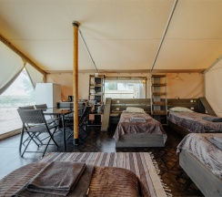 Сафари-тент для Друзей отлично подойдет для большой компании на 6-х человек, в которой есть все для отдыха и рыбалки! Имеются 6-ть раздельных кроватей, собственный санузел, зона барбекю и индивидуальный выход к пирсу для рыбалки.
