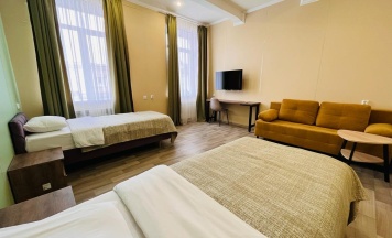 Номер улучшенный комфорт плюс с 3-мя односпальными кроватями. В номере собственная ванная комната с душем и туалетом. При необходимости за дополнительную плату возможно размещение дополнительного гостя на диване.