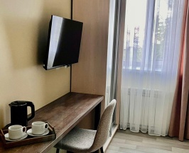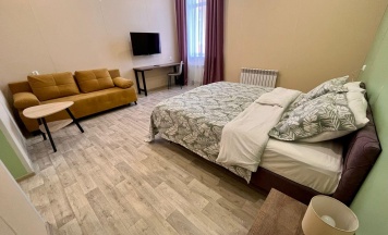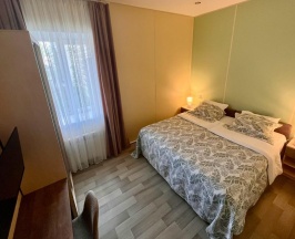 Номер улучшенный комфорт плюс с 1-ой двуспальной кроватью. В номере собственная ванная комната с душем и туалетом. При необходимости за дополнительную плату возможно размещение дополнительного гостя на диване.