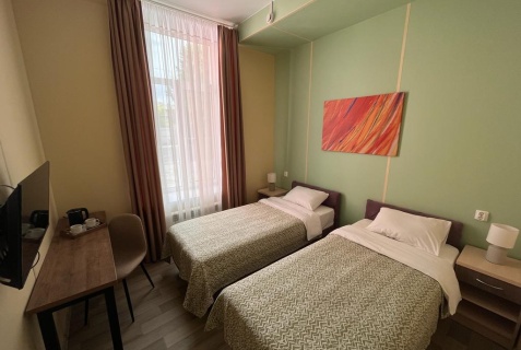 Номер улучшенный комфорт плюс с 2-мя односпальной кроватью. В номере собственная ванная комната с душем и туалетом. При необходимости за дополнительную плату возможно размещение дополнительного гостя на диване.