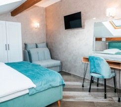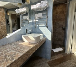 В номере двуспальная кровать + диван-кровать(можно использовать как дополнительное место) Ванная комната в номере.