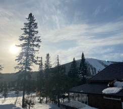 Красивый вид на гору. Хороший дом. Есть огромная кухня со всем необходимым. На балконах были кресла-качалки. На территории есть мангальная зона и подогреваемая купель.