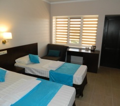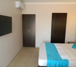 В нашем гостевом доме все номера класса делюкс оснащены: 2х спальная кровать, односпальная кровать, раскладное кресло, сплит-система, LED телевизор 42 дюйма (USB порт), холодильник, чайник (чайные чашки). Шкаф для одежды и белья, письменный стол, вешалка с зеркалом. Все номера имеют выход на широкую общую террасу - возле каждого номера своя зона отдыха с мебелью.