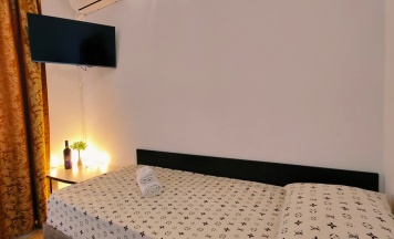 Отличный вариант для отдыха вдвоем. Номер оснащен: двуспальной кроватью, кондиционером, отдельной ванной комнатой и туалетом, телевизором, зеркалом, мини-холодильником, шкафом, прикроватной тумбой и журнальным столиком