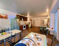 Есть большая просторная общая кухня со всем необходимым. Есть столики как на кухне, так и на открытом воздухе под навесом, за которыми можно покушать, а вечером посидеть и чего-нибудь выпить в приятной обстановке. Сидеть на улице можно хоть всю ночь, никто не выгоняет, главное вести себя культурно и ночью не шуметь, дабы не мешать спать другим отдыхающим. Взаимоуважение, друзья.