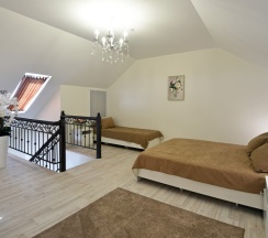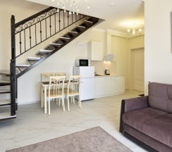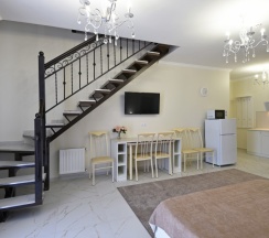 Этот уютный и просторный двухэтажный номер идеально подойдёт для большой семьи или группы друзей, обеспечивая комфорт и уединение на каждом уровне. Оформленный в светло-бежевых тонах, номер создаёт атмосферу тепла и уюта, обеспечивая всё необходимое для полноценного отдыха.