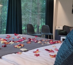 Подарили себе романтический уикенд в Brusnika Village. Нас встретили, в домике уже всё было подготовлено: свечи и лепестки роз по всему домику, игристое, фруктовая тарелка. Вечером парились в бане, потом сидели у очага на террасе. Ни Wi-Fi, ни телевизора — только мы и лес. На утро завтрак в домик и поздний выезд. Очень атмосферно и спокойно. Супер!