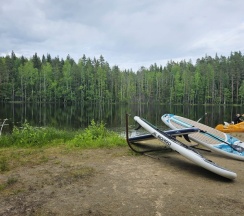 На территории много всего: сапы, лодка, гамаки, мангалы — и всё это можно использовать бесплатно. Очень понравилось, что посторонних людей нет, всё спокойно и безопасно. База в лесу, воздух потрясающий. Дети были в восторге от природы, озера и качелей. Отличное место для отдыха с детьми в Карелии — без анимации, но с настоящей природой.