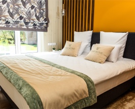 Дом располагает одной спальней и одной ванной комнатой с панорамным окном, террасой, мангальной зоной, панорамными окнами.