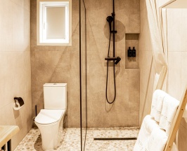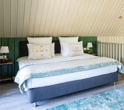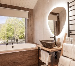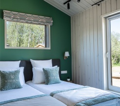Лодж с гостиной и большой спальней. В гостиной – функциональная мини-кухня, обеденная зона, зона отдыха с диваном и камином. По запросу предоставляем детскую кроватку, ванночку и детский стульчик для кормления.