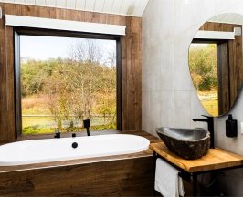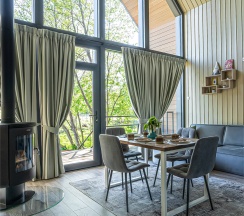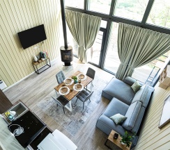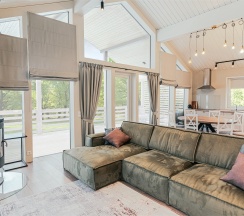 Большой комфортный лодж с панорамными окнами, тремя спальнями, двумя ванными комнатами и гостиной, оборудованной камином, зоной отдыха и обеденной зоной с кухней.