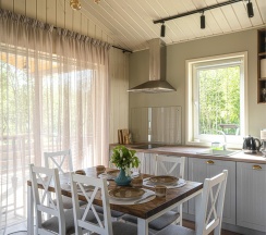 Дом располагает одной спальней и одной ванной комнатой с душем, террасой, мангальной зоной, панорамными окнами.