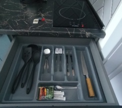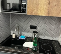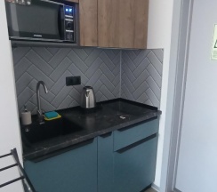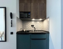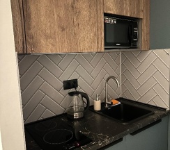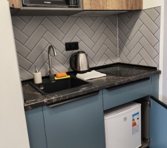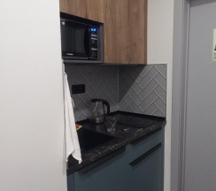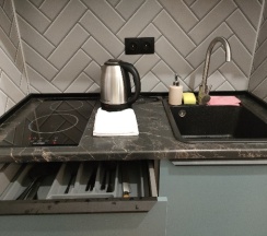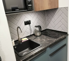 Кухня в номере прям вообще супер так же в номере была посуда, кастрюля и сковородка ( удобно не зависить от времени завтрака, через дорогу пятёрочка, а в остальное время все равно гуляете по городу там можно и перекусить)