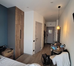 Отель не большой, но комфортный. В номере есть все необходимое. Можно приготовить себе еду, есть плита, посуда. Утюг, фен, чайник, микроволновая печь. Можно постирать вещи, за отдельную плату. Его нахождение вблизи к основным достопримечательностям, сразу убирает недостатки. Из недостатков, нам не понравилось качество уборки номера. В остальном, мы были готовы к тому, что номер будет маленький. Нам повезло, у нас был кондиционер в номере. Приветливый персонал на ресепшене. За отдельную плату можно позавтракать в ресторане рядом с отелем. В общем и целом,нам с детьми 11 и 2 -Х лет все понравилось.