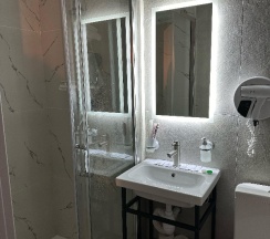 В номере нас встретила небольшая кухонная зона, всё необходимое: плита, чайник,посуда, столовые приборы, холодильник, микроволновка, раковина. Далее ванная комната с общим светом и подсветкой зеркала. Здесь же рабочий фен, держатели для полотенец. Напор воды хороший.