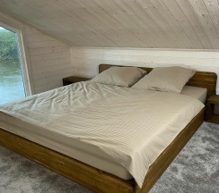 Двухместный номер VIP для тех, кто не хочет расставаться с привычным комфортом и роскошью. Номер находится в новом гостевом доме с витражными окнами, через которые открывается потрясающий вид на дикую природу. Первый этаж отведён для зоны отдыха, где довольные успешной рыбалкой или охотой туристы смогут отдохнуть и посмотреть телевизор, наевшись перед этим потрясающе вкусными блюдами. Второй этаж — спальный. Там находится большая двуспальная кровать с прикроватными тумбочками, расположенная у окна.