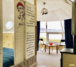 Действительно классное место! Все домики очень интересные, выполнены в разных стилях, такого у нас нигде больше нет. Мы жили в доме Кусто. Уютно, все красиво, ковры, большой, холодильник, ванна, все принадлежности, чистое постельное белье. Потрясающий вид на Байкал!