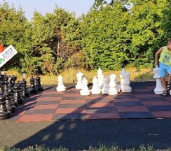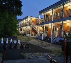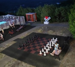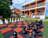 На территории есть детские площадки, мангальная зона, беседки, место для занятия спортом, огромная шахматная доска, очень хороший бассейн и комфортные шезлонги вокруг. Очень много семей с детьми. Дети играют, плавают, расставляют шахматы.