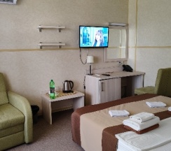 В номере есть всё необходимое для комфортного пребывания: удобная кровать с чистым бельём, кресло, телевизор, холодильник, сплит, чайник с чайными парами, шкаф с 6 вешалками, сейф, гладильная доска, сушилка. Пол тёплый и комфортный. В санузле душевая кабина, раковина, зеркало с подсветкой, фен. У каждого номера есть столик и 2 кресла. Так здорово наслаждаться природой, сидя на террасе с чашечкой кофе, который можно заварить в любое время.