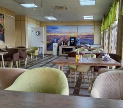 А какая там столовая! Это место релакса и наслаждения. Народу немного, мест всем хватает. Очень красиво и уютно. Никто никуда не торопится, принимают пищу и рассматривают природу через панорамные окна. Всё свежее и вкусное. Еда разнообразная, домашняя. Три основных приёма пищи и между ними можно приходить пить чай, кофе, соки, есть фрукты и мороженое.