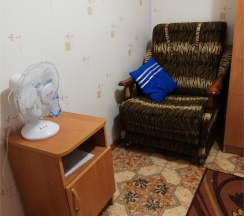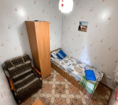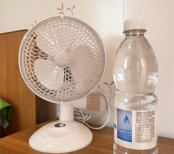 В номере стандартный набор мебели: шкаф, тумбочка, дополнительные одеяла, постельное бельё, мобильный кондиционер, бутылка воды.
