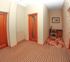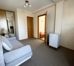 Полулюкс с двумя комнатами. В гостиной комнате расположен двуспальный диван, в спальной комнате - двуспальная и односпальная кровати. В номере могут с комфортом разместиться семья из четырех или пяти взрослых гостей и одного ребенка возрастом до 4 лет включительно (при размещении на спальном месте с родителями). В номере есть собственный санузел с душем. Номер оснащен индивидуальным кондиционером и имеет доступ к сети Wi-Fi. Имеется телевизор (федеральные каналы), мини холодильник, фен, журнальный столик, стулья, шкаф для одежды с полками и плечиками. В санузле для вашего удобства есть жидкое мыло, туалетная бумага, комплект полотенец (для ног, лицевые и банные). Номер расположен на третьем этаже.