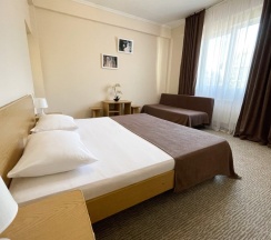 Двуспальная кровать и кресло кровать позволят с комфортом разместиться семье из трех человек. Без доплаты возможно размещение одного ребенка возрастом до 4 лет включительно при размещении на спальных местах с родителями. В номере есть собственный санузел с душем. Номер оснащен индивидуальным кондиционером и имеет доступ к сети Wi-Fi. Имеется телевизор (федеральные каналы), мини холодильник, фен, журнальный столик, стулья, шкаф для одежды с полками и плечиками. В санузле для вашего удобства есть жидкое мыло, туалетная бумага, тапочки, комплект полотенец (для ног, лицевые и банные). Номера комфорт находятся с первого по четвертый этаж.