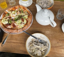 Зашли пообедать в их ресторан. На втором этаже есть потрясающая терраса. Паста с курицей и грибами, пицца куриная с грибами и фирменный салат Цей - безупречны.