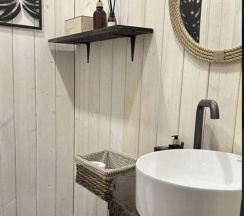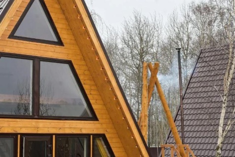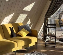 А-фрейм треугольный дом, для отдыха 6 гостей. 6 спальных мест - на втором этаже большая двуспальная кровать, на первом этаже два удобных двуспальных дивана. Кухня со всем необходимым - большой обеденный стол, посуда, плита, микроволновка, чайник, холодильник, моющие эко-средства, губки, чай разных сортов и кофе. Большой ТВ, Wi-Fi. Во дворе мангальная зона, костровая чаша, уютная беседка, терраса.