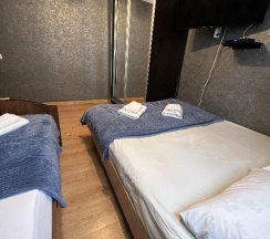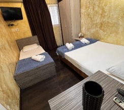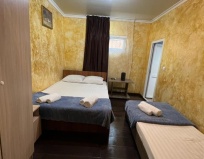 Фото соответствует действительности. Очень удобно, что рядом с морем. Есть полотенца, жидкое мыло, туалетная бумага и фен. Кондей рабочий. Двоим будет очень тесно в этой комнате. Звукоизоляция =0. Есть общ.кухня с посудой, плитой, СВЧ и термопотом.