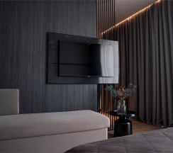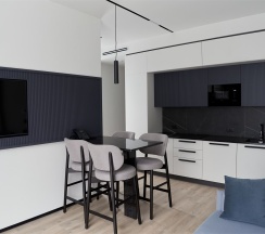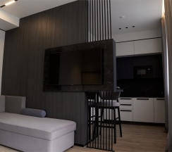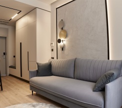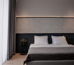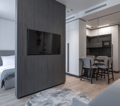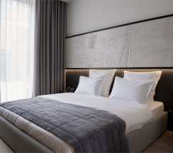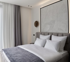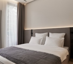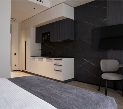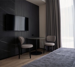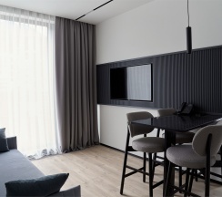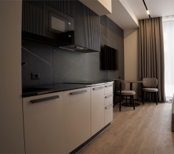 Однокомнатный номер площадью 35 кв. м. с двуспальной кроватью 180*200 раскладным диваном в гостиной (2 дополнительных спальных места). Выделенная спальная зона. Новый ремонт выполнен в современном стиле, панорамные окна с видом на бассейн или горы. Оборудованная кухонная зона с варочной индукционной поверхностью и СВЧ-печью.