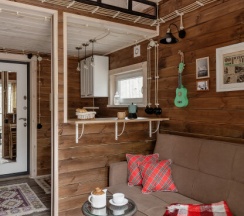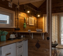 В доме находятся кухня, ванная комната, мансардный этаж, раскладной диван на первом этаже с журнальным столиком, который раскладывается в обеденный, кресла-качалки на террасе у домика.