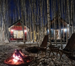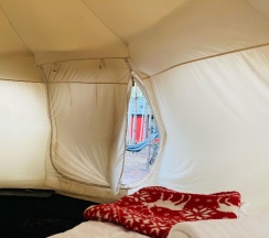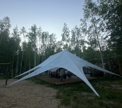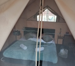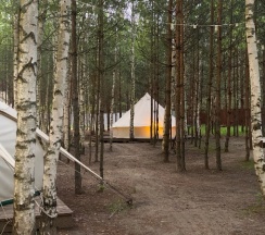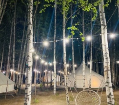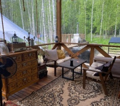 Была в шатре на одну ночь, очень понравилось. Чистый воздух, лес, птицы поют, в 20-30 минутах ходьбы берег Волги, где можно встретить закат. Есть удобная веранда, где можно попить чай в любое время. В самом шатре были обогреватели и элетропростыня, ночью не замерзли.