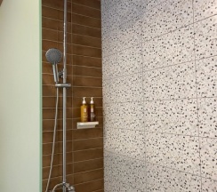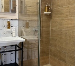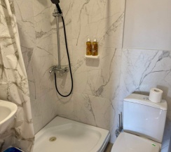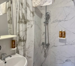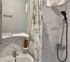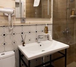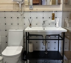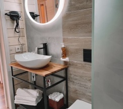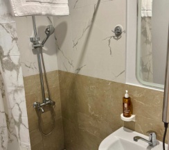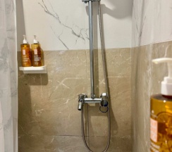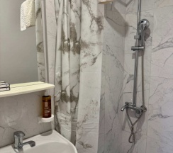 -Современный санузел с душевой, феном, косметическими принадлежностями