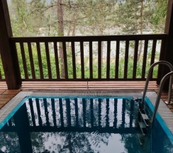 Месторасположение у базы просто отличное! На берегу Катуни. У нас было шале-студия с видом на реку. Домик очень хороший, чисто, уютно! Заказывали чан. Получили массу удовольствия! Стоит на берегу, вечером красиво подсвечивается лампочками. В чан нам положили травы, веточки рябины!