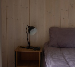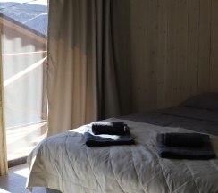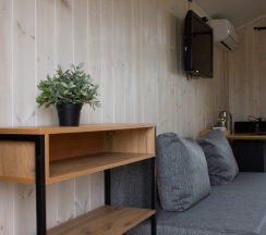 Шале оборудованы мебелью: двуспальная кровать с прикроватными тумбочками, диван раскладной, стол, два стула. Имеется шкаф для одежды, тумбочка для обуви, в ванной комнате имеется полка для полотенец и халата.