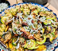 В комнате массажное кресло с могучим Yamaguchi и приятнейшая кухонная зона. Она - и удобный мангал неподалеку - вдохновили нас устроить настоящий званый ужин с овощами-гриль и рыбками! 🐠