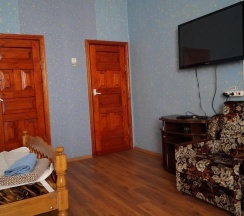 Шестиместный номер стандарт с 2 двуспальными, 2 односпальными кроватями и раскладным диваном. В номере: холодильник, кондиционер и телевизор.