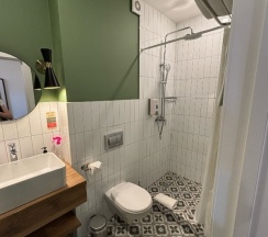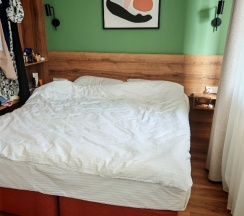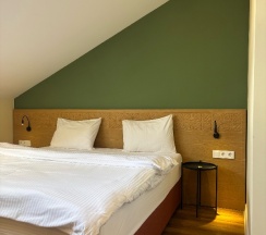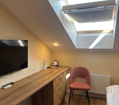 Сняли на ночь в данном отеле двухместный номер стандарт улучшенная мансарда. Ни разу не пожалели, что выбрали именно этот отель. Девушка Анастасия на ресепшене смогла заселить нас раньше 15:00, что нам было очень важно. Спасибо ей огромное. Нам всё очень понравилось, всё чисто и красиво. В комнате есть чайник, по 2 пакетика черного и зеленого чая, две кружки, холодильник маленький. В ванне под раковиной лежал фен. При входе сразу лежат тапочки. На прикроватных столиках лежали новые беруши в упаковке. Для тех, кто будет заселяться в номер с мансардой: окно вечером со включенным светом не открывайте, комары залетают только так, ведь окна там без сетки и открываются своеобразно, но всё исправно, есть жалюзи. В общем всё очень понравилось, приедем еще)))