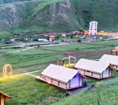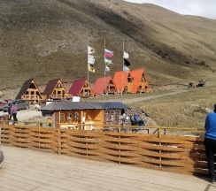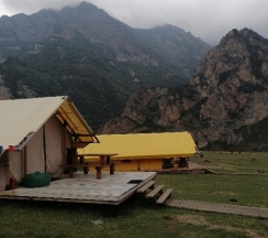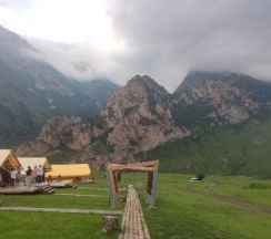 Место очень красивое, домики расположены так, что горы видны со всех сторон. В домиках есть обогреватели, тёплые одеяла, простыни с подогревом. Выдают полотенца. Душ и туалеты находятся отдельно, есть как тёплые, таки прохладные. На территории люди живут и в палатках тоже. Связи почти нет, Wi-Fi очень слабый, можно только сообщения через вотсап отправить, а телеграм вообще не загружается. В домиках чисто. На территории работают два кафе, одно с национальной кухней(можно купить хачины, лагман или плов), у другого кафе меню очень обыкновенное. Выбор в обоих кафе небольшой, магазинов чтобы что-то купить нет. Отдельно продают кофе из кофемашины, только одна точка. Оплата только наличкой, никаких терминалов, а так как связь очень плохая онлайн-перевод может не сработать. Из развлечений поездки на водопады, в красивые места, пароплан, эндуро, квадроциклы, катание на лошадях, джампинг. Место классное для тех, кто хочет отдохнуть от людей и суеты.